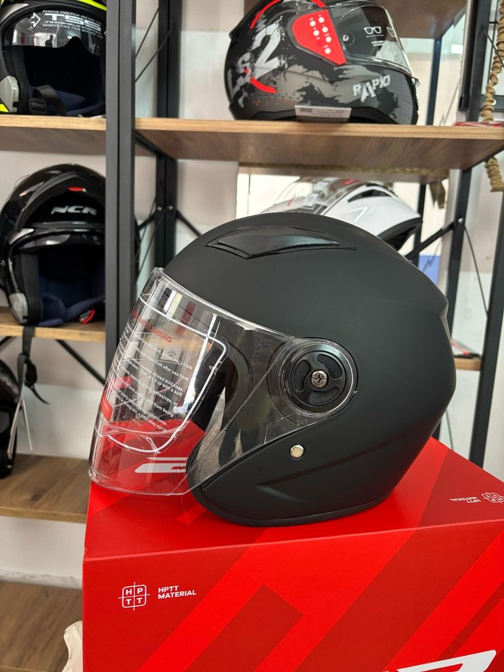 Mat siyah renkte, şeffaf vizörlü ve tokalı Diger biker kask. Plastik malzemeden yapılmış, minimalist ve rock punk tarzı yansıtıyor. ️
