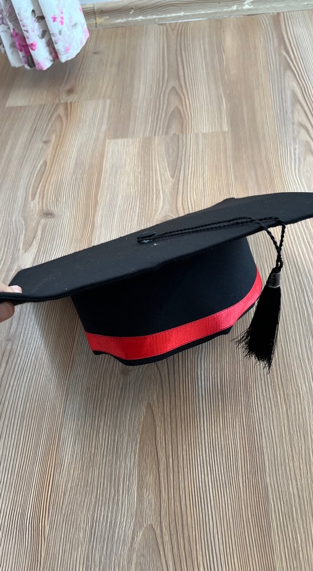 Diger markanın siyah mezuniyet kepi, kırmızı bant ve püskül detayı ile minimalist ve klasik tarzda tasarlanmıştır.