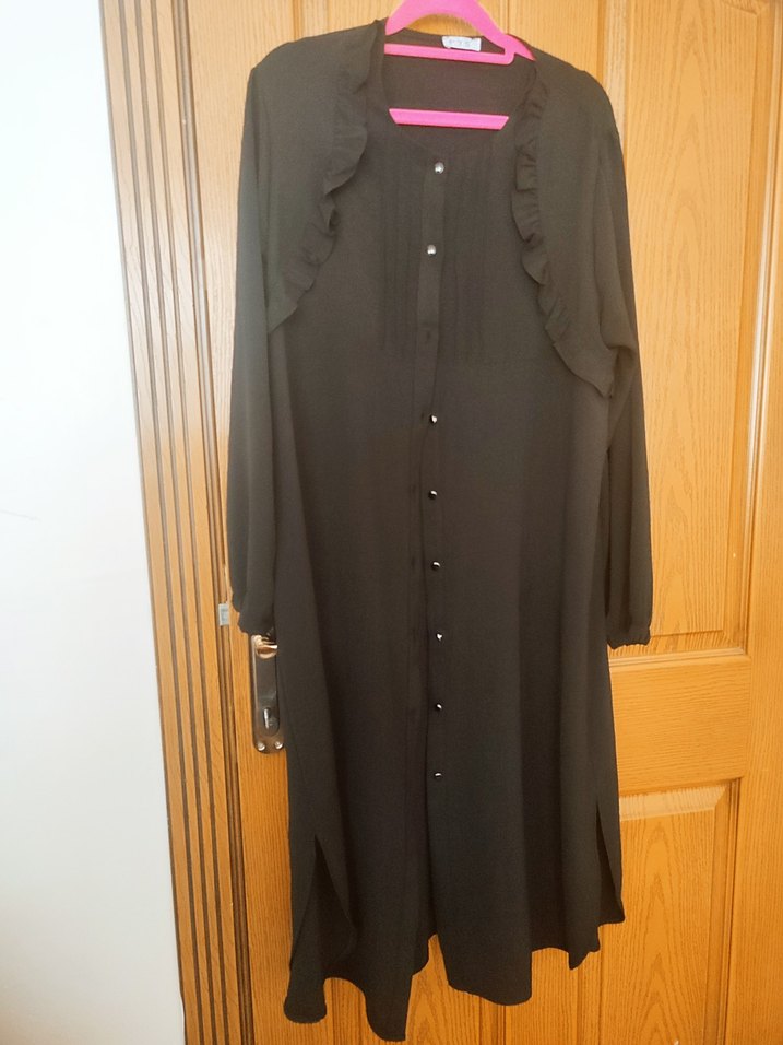 uzun, düğmeli ve notched lapel yakalıkadın tunik modeli. Siyah renkte, uzun kollu, bol kesim ve ipeksi dokuda, bir kere giyildi tertemiz canlı renk