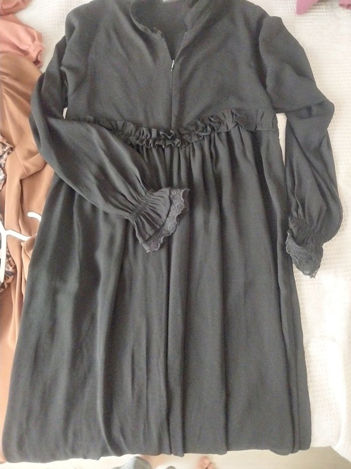 Diger markasının siyah ferace modeli, yüksek yaka ve uzun kollu. Bel ve manşetlerde fırfır detayları bulunur. Rahat kesim ve Medine ipeği kumaş.