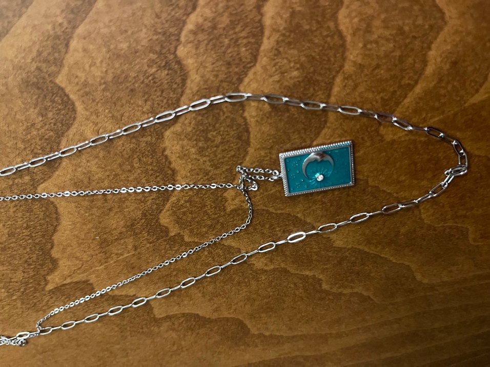 Diger markasına ait uzun, parlak zincir detaylı turkuaz renkte, baskılı kolye. Bohem ve retro tarzda, günlük kullanıma uygun. Çelik