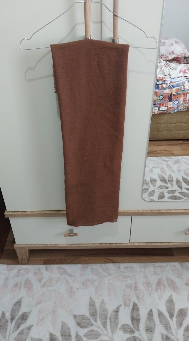 Diger markasının uzun kahverengi, desensiz, sade ve bohem tarzda şalı. Koyu tonlarıyla minimal ve temel bir görünüm sunar.