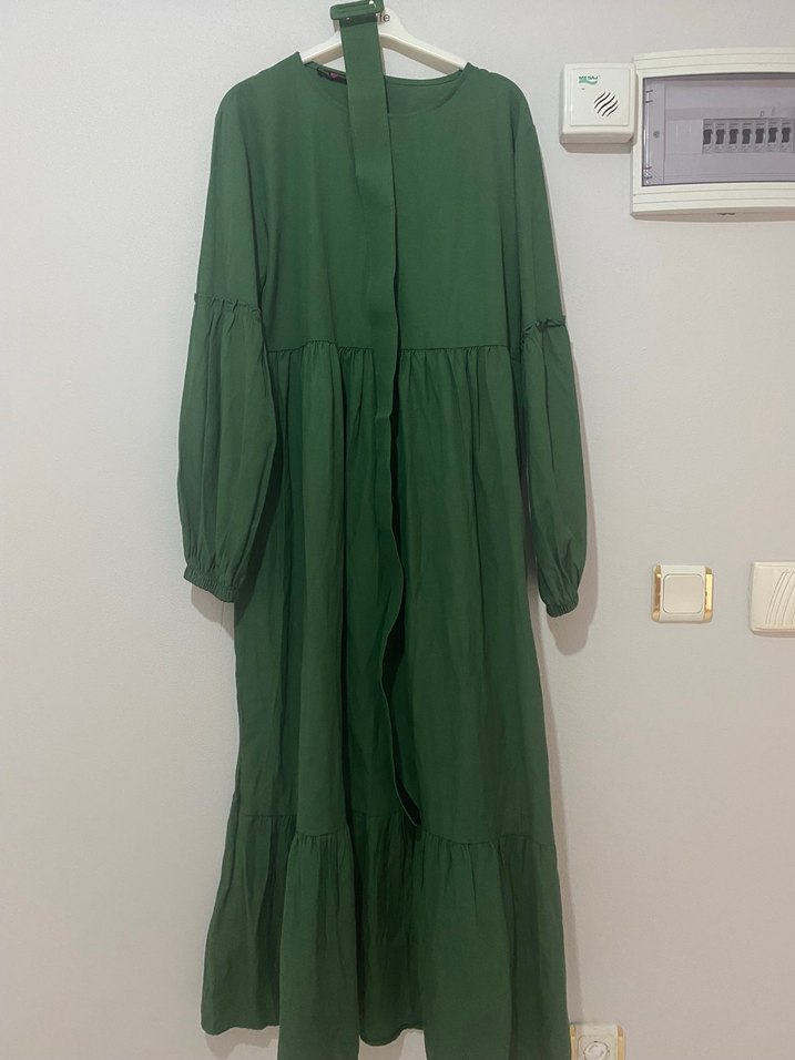 Diger markanın yeşil uzun elbisesi, salaş kesim ve fırfır detaylara sahip. Yumuşak keten kumaştan, uzun kollu ve bohem tarzda, günlük kullanıma uygun.