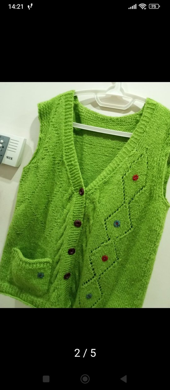 Diger'in renkli yeşil, V yaka, kolsuz ve bol kesim kadın yeleği, yumuşak örgü kumaştan ve ince nakış detaylıdır.