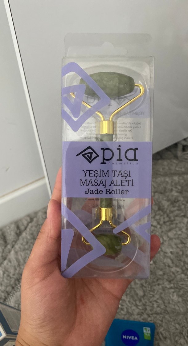 Diger markasına ait yeşim taşı masaj aleti, cilt rahatlatıcı ve kan dolaşımını destekleyici yumuşak bir jade roller içerir. Şeffaf kutuda, mor detaylıdır.