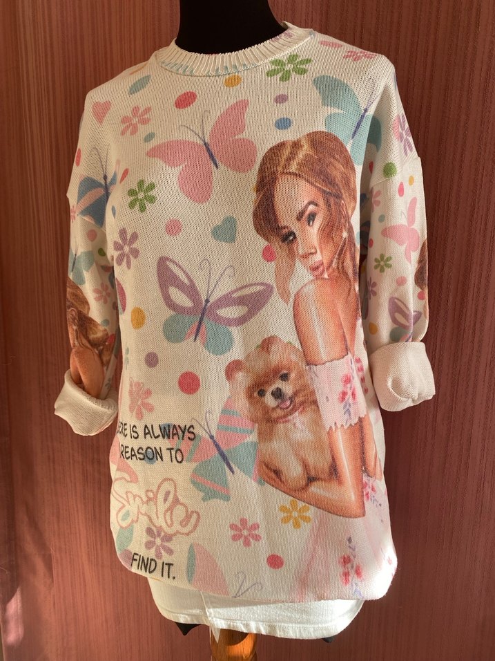 Rahat kesim, uzun kollu, yuvarlak yaka bej örgü kazak. Renkli kelebekler, çiçekler ve köpek tutan kız figürü baskılıdır. Yazılar mevcuttur.