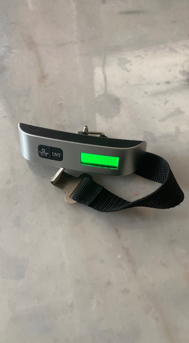 Gri renkte dijital bavul tartısı, net LCD ekran ve sağlam askı kayışı ile güvenli tartım sağlar. Güç ve birim düğmeleri bulunur. ⚖️