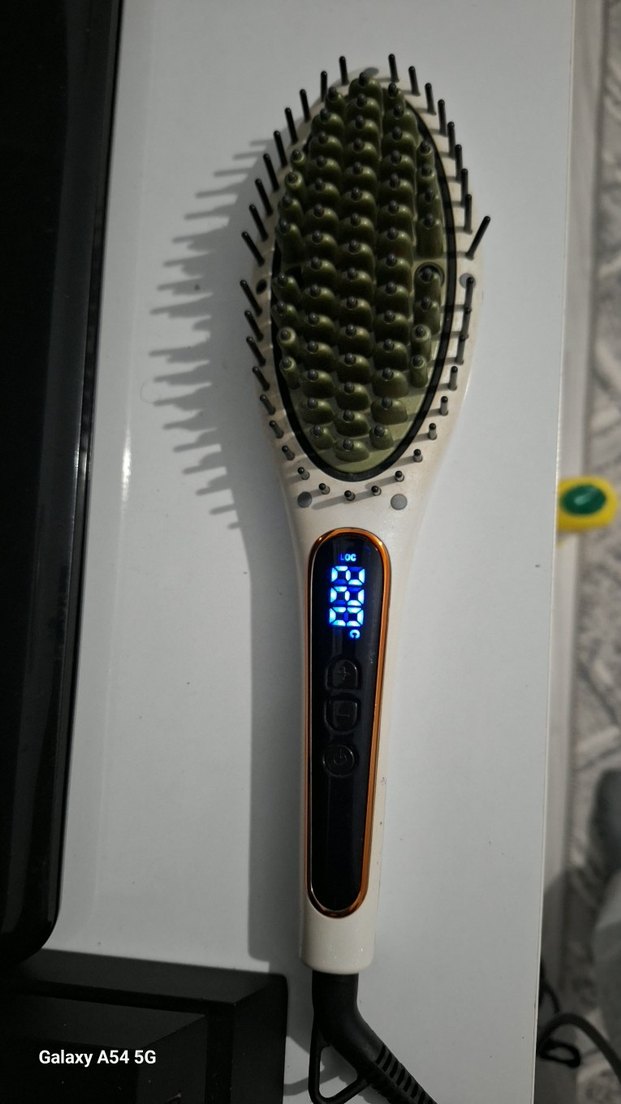 Dijital ekranlı beyaz saç düzleştirici tarak, ayarlanabilir ısı ve yuvarlak uçlu kıllarla nazik kullanım sağlar. Ergonomik tasarıma sahiptir. fişe taktım çalıştı baya sıcak olarak ısındı fakat kullanımından anlamadığım için kurcalamak istemedin yani çalışır durumda ✨