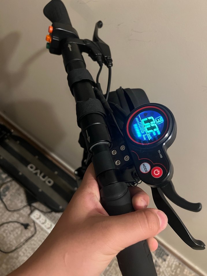 Bu siyah çocuk scooter'ı, hız ve pil takibi için dijital ekrana ve rahat sürüş için ergonomik 55 hız.