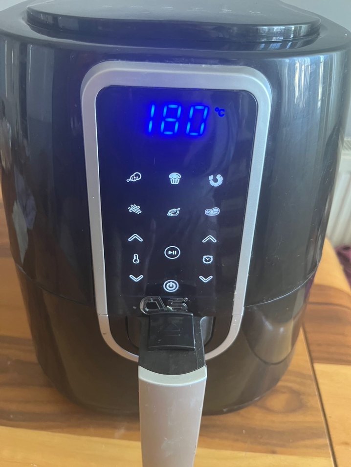 180°C sıcaklık gösteren dijital dokunmatik ekrana sahip siyah hava fritözü. Ön ayar pişirme ikonları ve kolay kullanım için kulp bulunur.