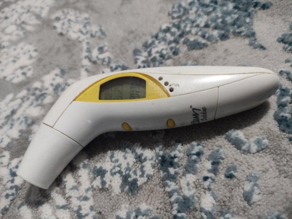Gri ve sarı renkli, LCD ekranlı dijital kulak ateş ölçer. Kolay kullanım için düğmeler bulunur, hassas ölçüm yapar. ️