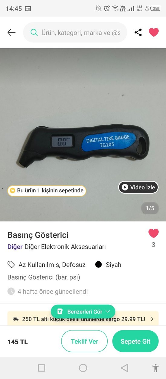 Siyah renkli, az kullanılmış ve defosu olmayan TG105 model dijital lastik basınç göstergesi, bar ve psi birimlerinde ölçüm yapar. ️