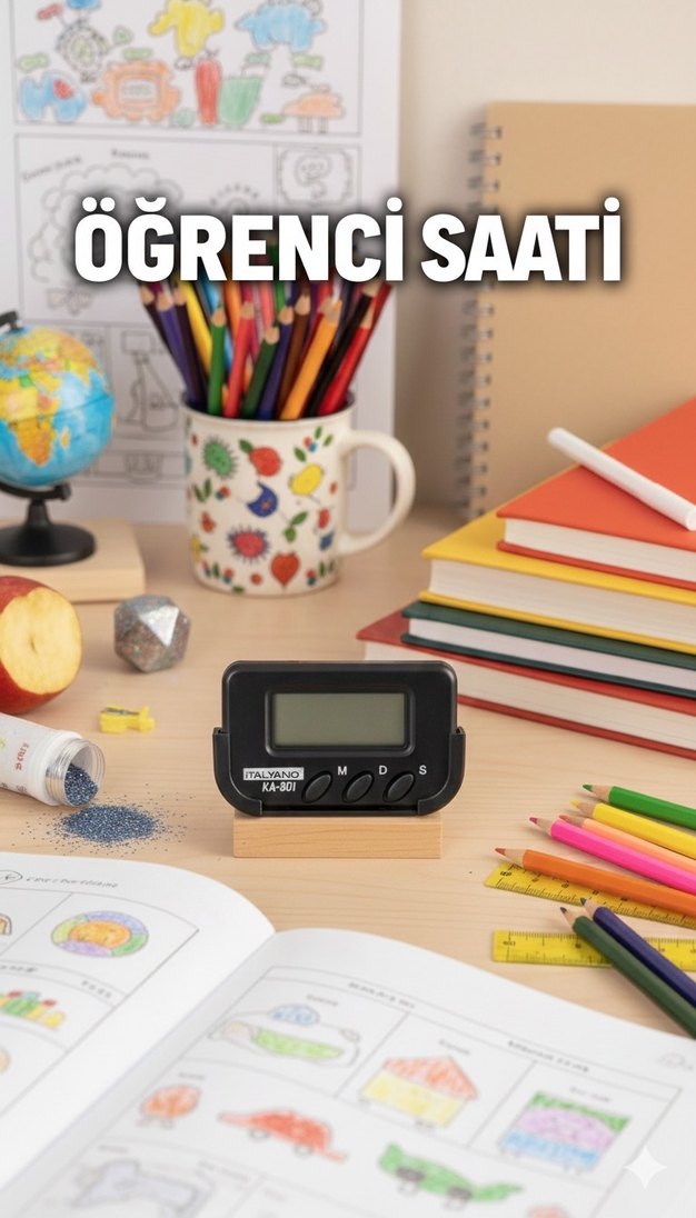 Okul aktiviteleri için uygun, camel renkli dijital öğrenci saati. Temiz ekranı ve basit kontrol tuşları bulunur. ⏰