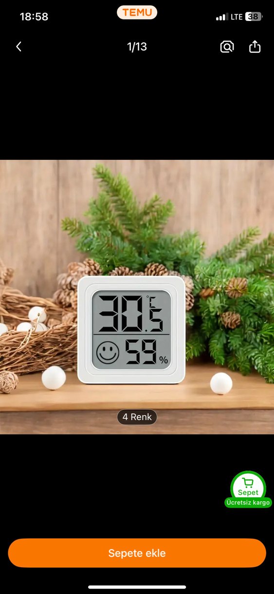 Bu dijital cihaz sıcaklık (°C) ve nem oranını gösterir. Rahatlık göstergesi için gülen yüz simgesi bulunur. Gövdesi gri ve kompakt yapıda. ️çinden geldi pilli çalışır sıfır