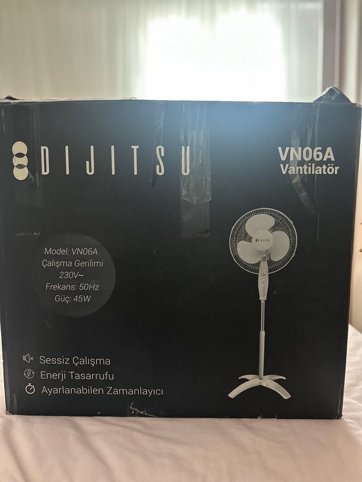 Dijitsu VN06A vantilatör, sessiz çalışma, enerji tasarrufu ve ayarlanabilir zamanlayıcı özelliklerine sahiptir. 230V, 50Hz frekans ve 45W güç ile çalışır.
