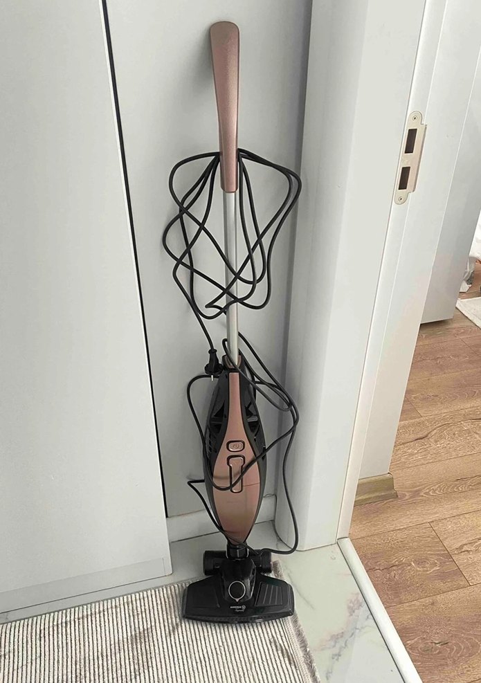 Uzun saplı, bej ve koyu renkli dik elektrikli süpürge, kablosu ile kolay kullanım sağlar. Zemin ve halı temizliği için uygundur.