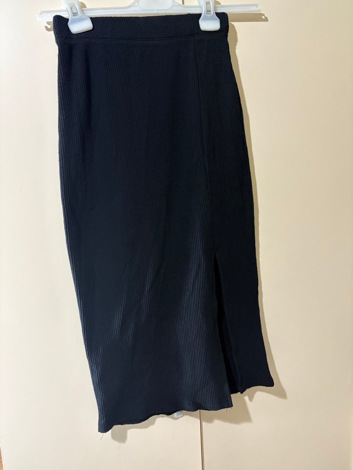 Dik kesim ve yırtmaç detaylı siyah uzun etek, yumuşak sentetik kumaştan üretilmiştir. Minimalist tasarımı günlük kullanıma uygundur.