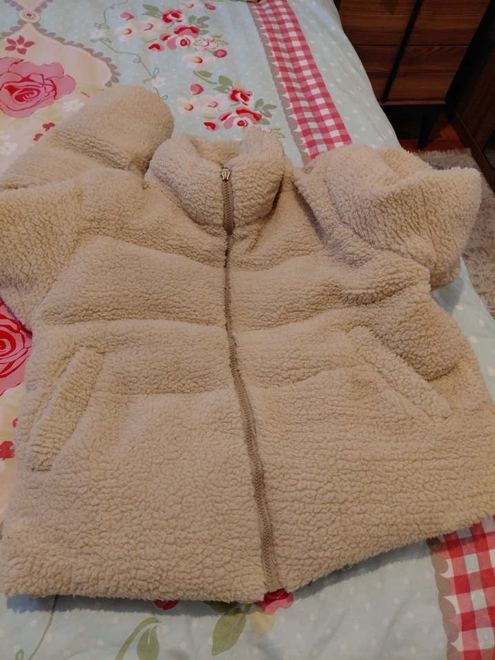 Dik yakalı, uzun kollu, kısa boy peluş mont. Yumuşak ve sıcak kumaştan, kürk detaylı, pastel bej renkte ve normal boyda.