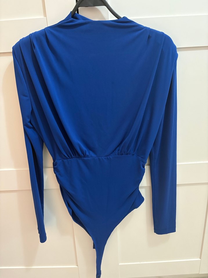 Lacivert, dik yakalı, uzun kollu, drapeli ve vücuda oturan bu bluz, ofis için uygun, yumuşak sentetik kumaştandır.