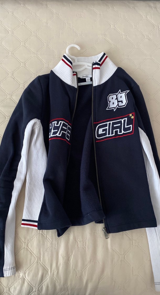 Dar kesim, uzun kollu, dik yakalı ve fermuarlı kadın sweatshirtü. Yumuşak ve sıcak kumaştan, baskılı detaylı ve koyu mavi renkte, günlük kullanım için uygun.