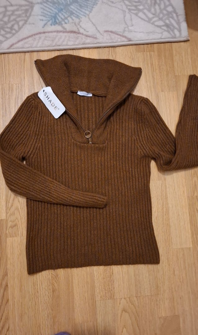 Dik yakalı, uzun kollu, kahverengi örgü kadın kazak. Yumuşak dokulu, rahat ve günlük kullanıma uygun, normal boyda ve dar kesim.