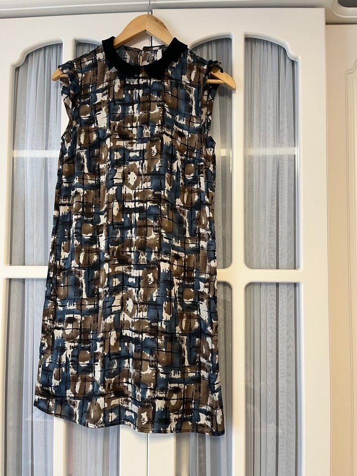 Dik yakalı, kolsuz .ve kahverengi tonlarda koyu bağlama desenine sahip, günlük kullanım için uygun.