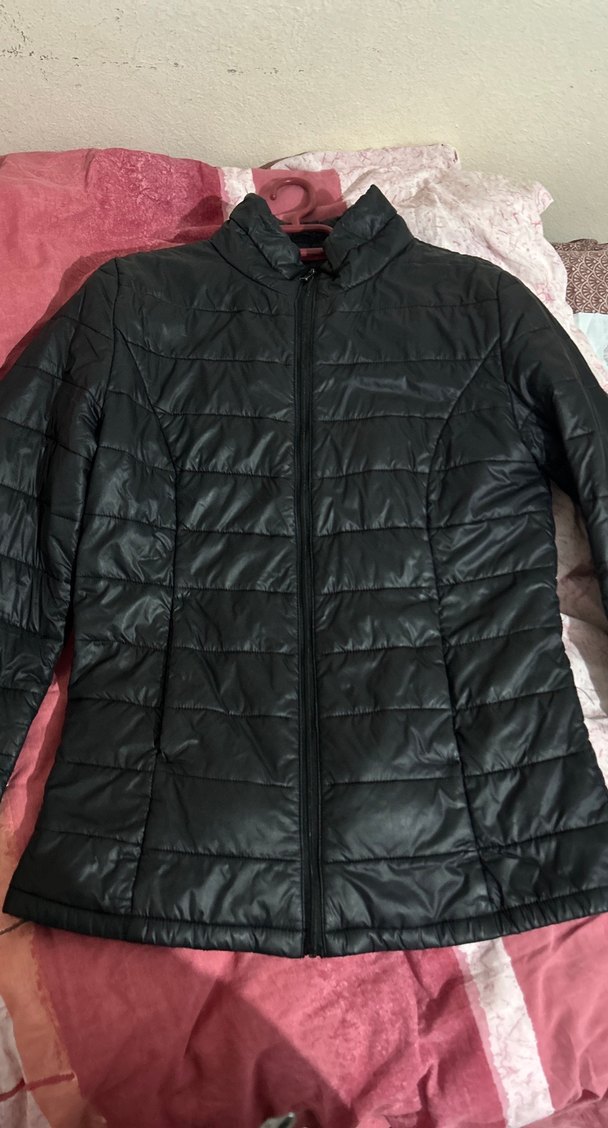 Dik yakalı, fermuarlı, siyah kadın mont. Uzun kollu, normal midi boyunda, yumuşak sentetik kumaştan, rahat sokak stili için uygundur.