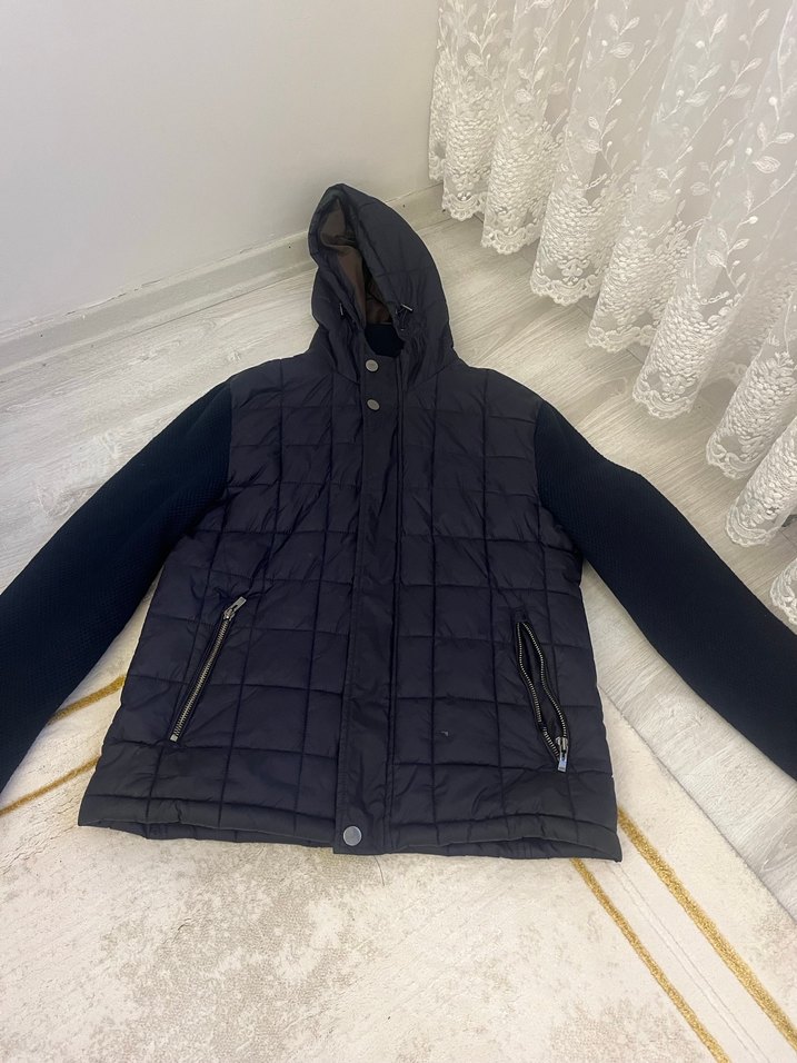 Siyah erkek mont, fermuarlı cepler, kapüşon ve uzun kollu, dik yaka detaylı, rahat kesim ve dış mekan kullanımı için uygundur.