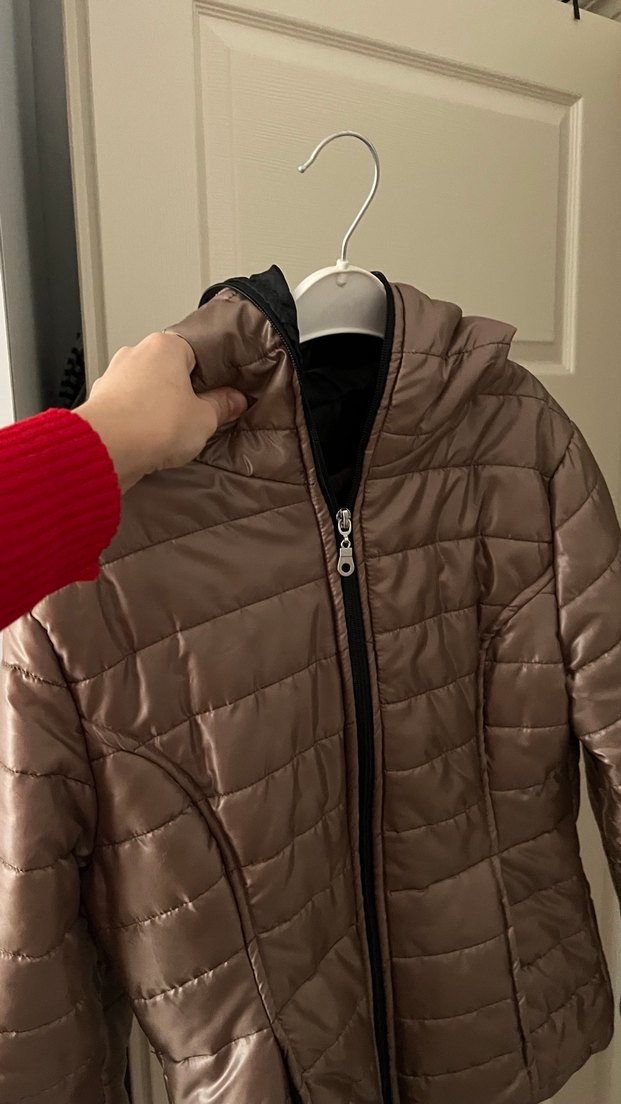 Kahverengi, dik yakalı ve fermuarlı kadın mont. Uzun kollu, midi boy ve yumuşak sentetik kumaştan, trend sokak tarzı için uygun.