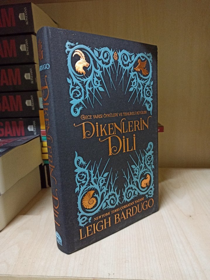 Leigh Bardugo'nun "Dikenlerin Dili" kitabı, karanlık peri masalları ve etkileyici öyküler içerir. Kitap, simgesel çizimlerle süslü şık bir kapak tasarımına sahiptir.