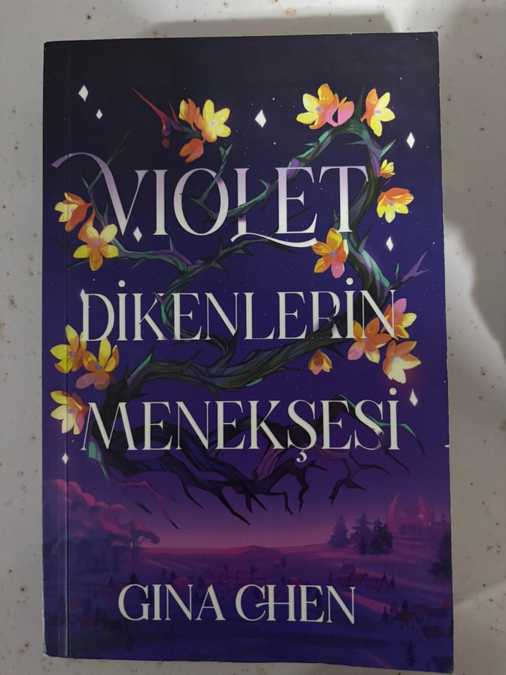 Gina Chen'in 'Dikenlerin Menekşesi' adlı romanı, menekşe çiçekleri ve dikenli sarmaşıkların yer aldığı mor tonlarda bir kapak tasarımına sahiptir.