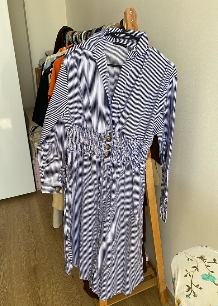 Dikey çizgili midi boy belden lastikli elbise (maksimum 3-4 kere kullanıldı) sadece bel lastiğinde ufak bir sökük mevcut, tamir edilebilir