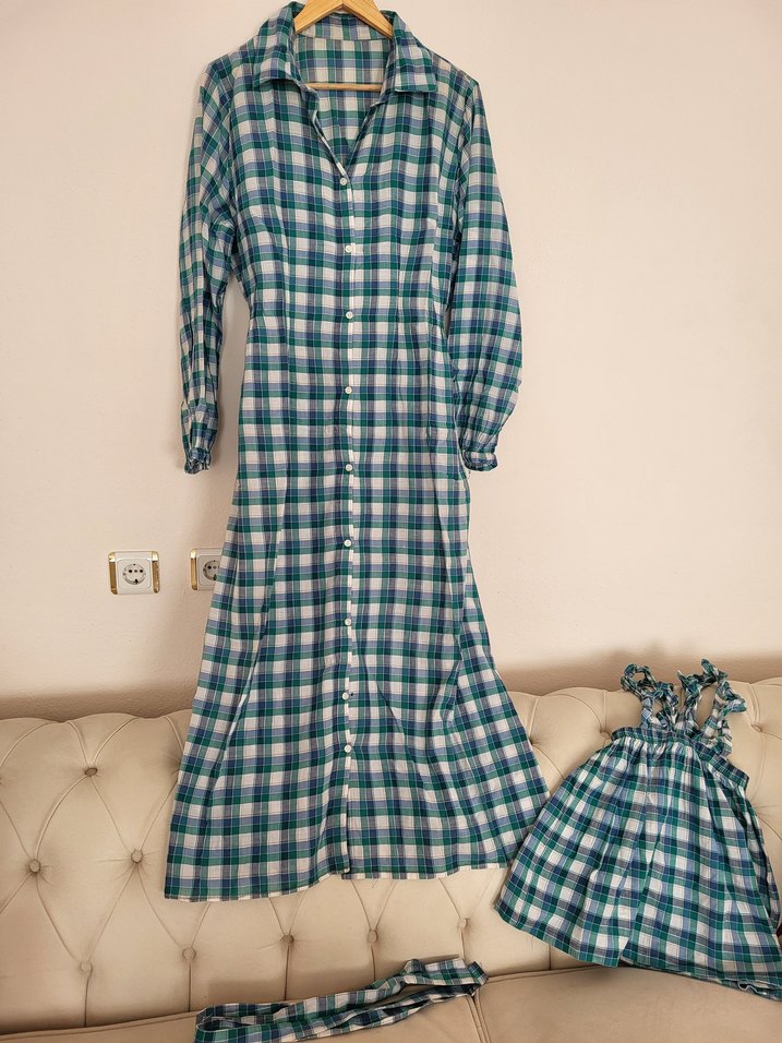 Pamuklu, düğme görünümlü uzun kollu, bol kesim elbise. Yeşil kareli desenli, yakalı ve vintage tarzda günlük kullanım için uygundur. annekız kombin küçük kusuru var resimde belirttim çocuk 4.5 .6 yaşa uygun anne 40.42 beden