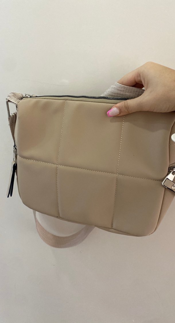 Bej renkte, fermuarlı ve dikişli tasarıma sahip deri kadın çantası. Pastel tonlarda, desen içermeyen sokak stiline uygun bir model.