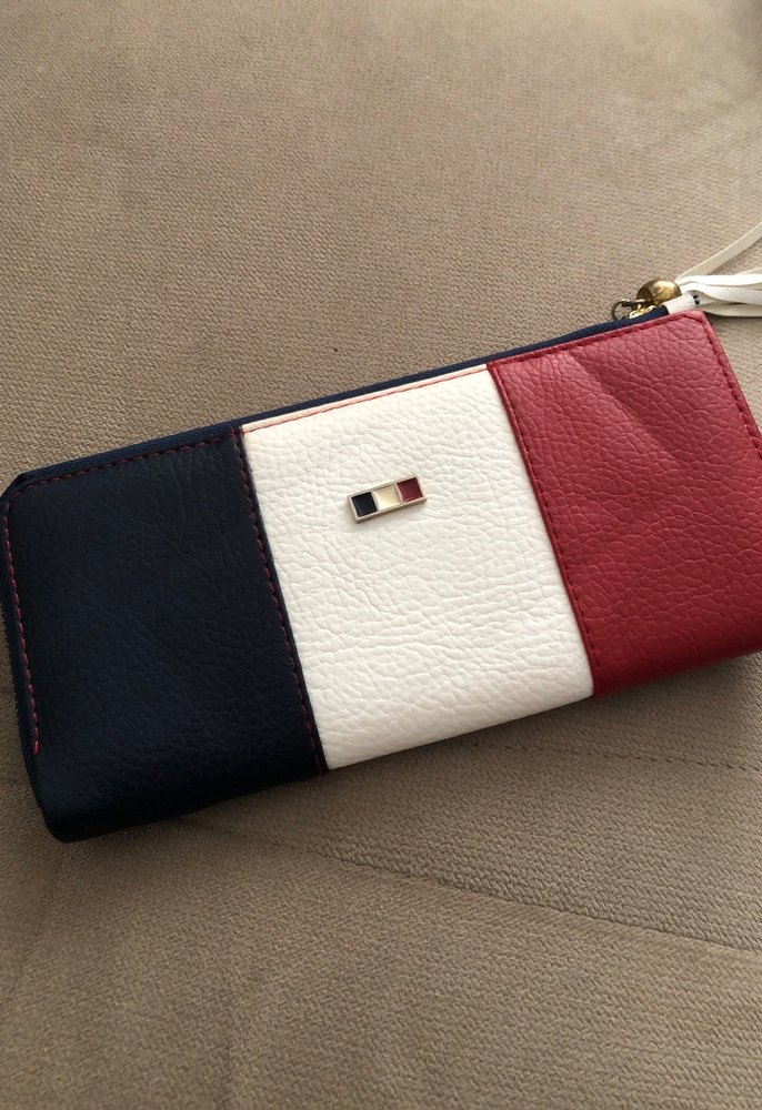 Dikişli detaylı, çok renkli deri kadın cüzdanı, fermuarlı ve sokak modasına uygun rahat tarzda.