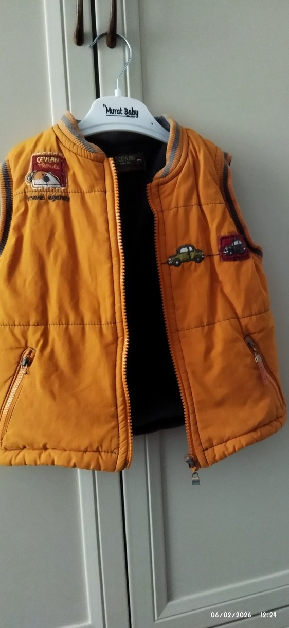 Dikişli kapitone kahverengi erkek çocuk yeleği, kollu olmayan tasarım, yakasında kesimli detay ve fermuarlı cepler bulunur. Trendy ve şık görünüm sağlar.