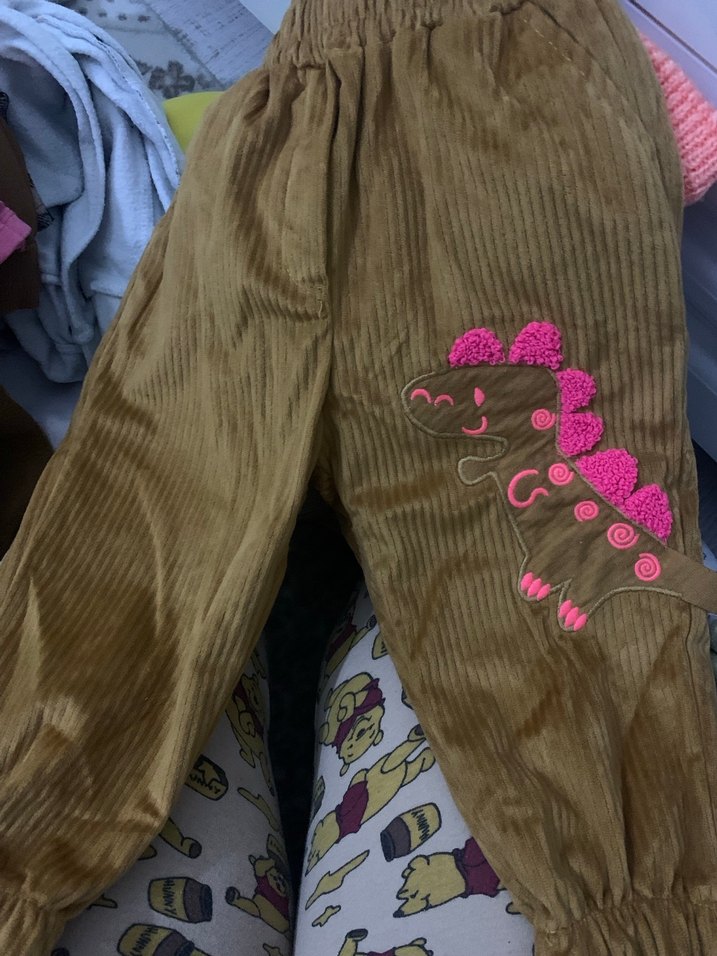 Renkli işlemeli dinozor detaylı, düğmeli ve fitted kesim kahverengi kız çocuk pantolonu, trend sokak stili için uygundur.