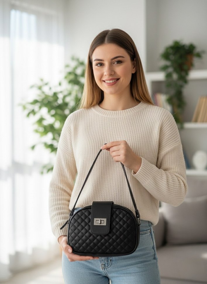 Dikişli Siyah Deri Kadın Omuz Çantası