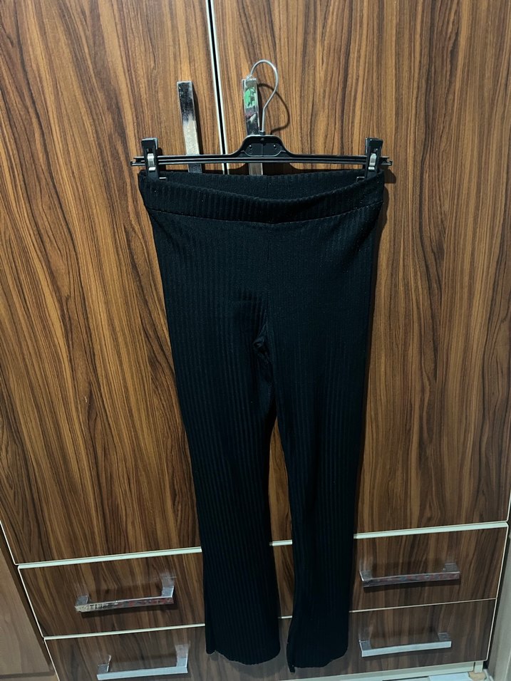 Dikişli, pilili siyah pantolon Sentetik kumaştan üretilmiş, günlük rahat kullanım için uygundur.