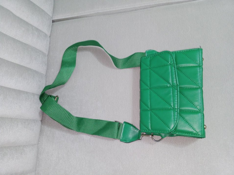 Dikişli desensiz yeşil, kemerli kadın çantası, yumuşak sentetik kumaştan, sokak modasına uygun.