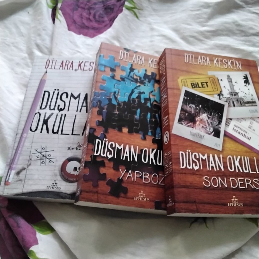 Dilara Kes'in 'Düşman Okulu' adlı roman seti, yapboz ve bilet temalı kapaklarla sunulmaktadır. tek haldede alınabilir