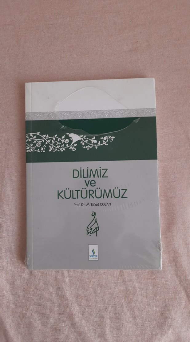 Prof. Dr. M. Es'ad Coşan imzalı "Dilimiz ve Kültürümüz" kitabı, dil ve kültür konularını işliyor. Osmanlıca unsurlar taşıyan sade kapak tasarımıyla.