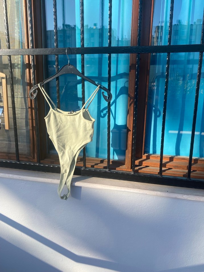 Mint yeşili, yanları pencereli, dilvin marka, 38 beden bodysuit.