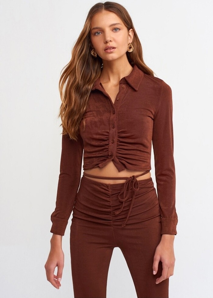 Dilvin Bağcıklı Mini Gömlek kahverengi S beden çok az kullanıldı herhangi bir defosu yoktur kadifemsi bir kumaşı var