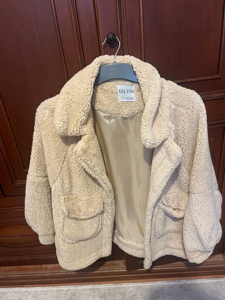 DILVIN markalı, peluş kumaştan yapılmış, kürk detaylı, bej renkli, uzun kollu, normal midi boyda, rahat kesim kadın ceket. Sokak stiline uygun, sıcak ve konforlu bir parça.