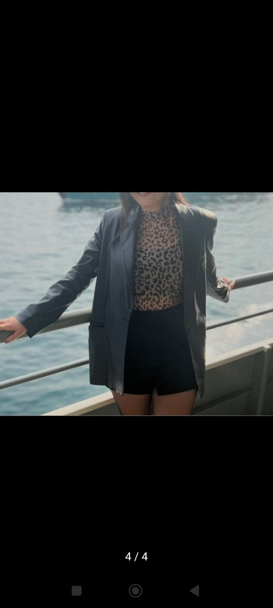 Dar kesim, kısa uzunlukta kadın blazer'ı, kesik yaka ve uzun kolludur. Gri deri malzemeden, koyu leopar desenlidir ve tokalı detay içerir. İş ve sokak stili karışımıdır.