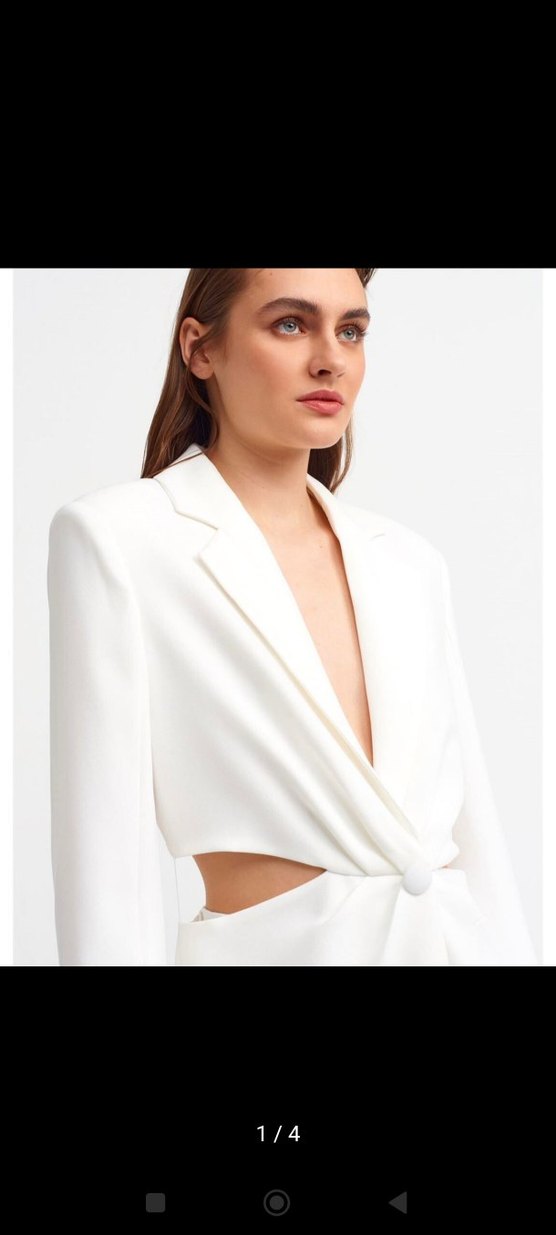 Sıfır Beyaz blazer, V yaka ve uzun kollu. Drapeli tasarıma ve düğme detayına sahip, ofis için uygun modern tarzda.sifir etiketli