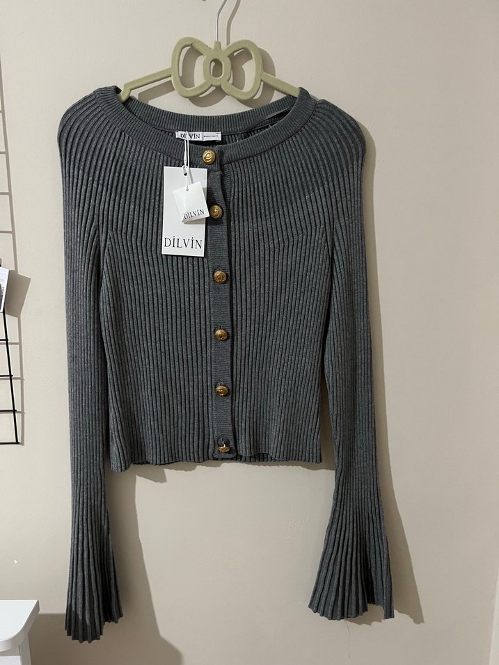 Düğmeli ön yüzü, uzun kollu ve yuvarlak yakalı, fit kesim gri triko kadın kazak. Hiç giyilmedi etiketi üzerindedir. Beden standart