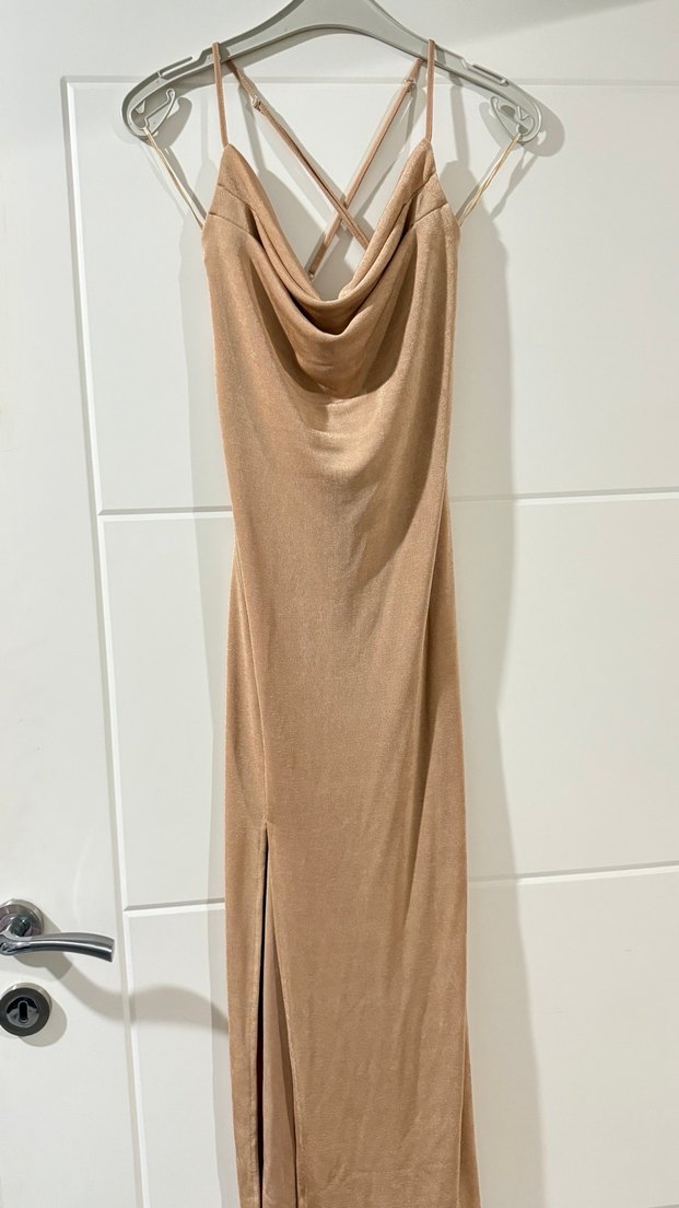 Satıldı . Parlak kumaşta göğüs drapeli çok şık bir elbise önden yırtmacı var astarsız sırtı çapraz m ve L beden için uygun
