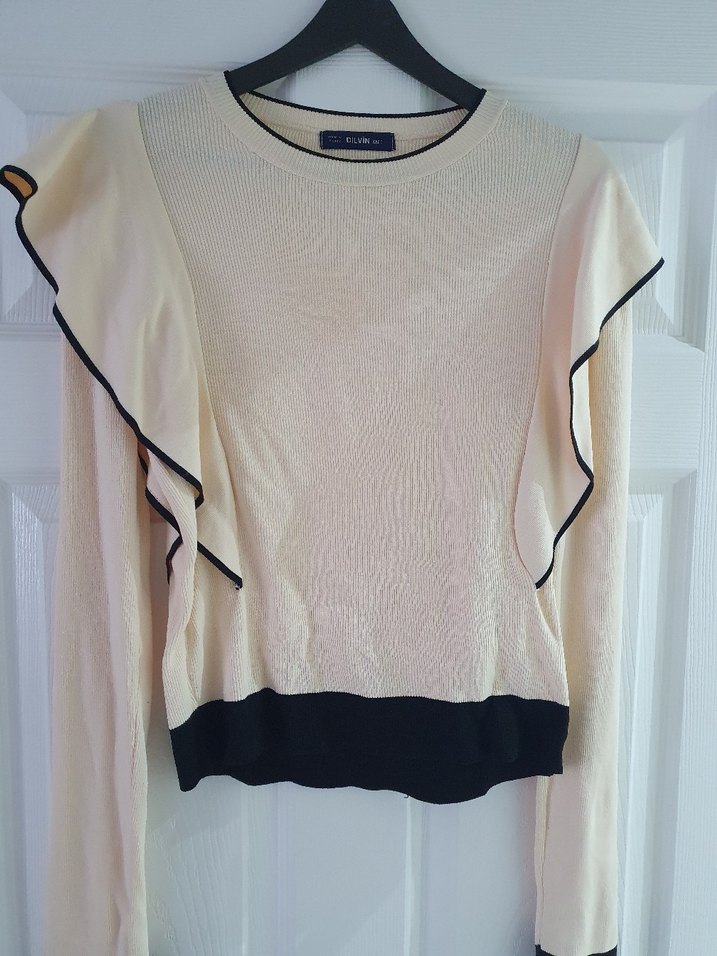 az kullanilmis sifir ayarinda. yumuşacik dilvin marka triko. Kadınlar için uzun kollu, yuvarlak yakalı, fırfırlı detaylı pamuklu kazak. Rahat kesimi ve normal boyu ile günlük sokak stiline uygun, beyaz ve siyah detaylıdır.